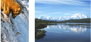 Grizzly bear fishing for salmon (by Dmitry Azovtsev via Wikimedia Commons); Mount McKinley and Wonder Lake, Denali National Park, Alaska (via Wikimedia Commons)