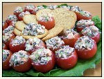 Shrimp Salad Stuffed Tomatoes – Tiny shrimp join the fresh flavors of basil, olives, shallot, white wine vinegar, and more to make cherry tomatoes a hit finger food of the day.