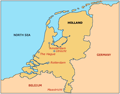Holland is actually just a small part of the Netherlands, but its name has come to refer to the country as a whole. (Vocabulary lesson of the day: this is known as “synecdoche.) The Netherlands borders Germany to the east, Belgium to the south, and the North Sea to the north and west.